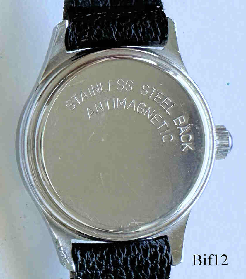 This is a Bifora ladies quartz watch, using the improved unique movement B19 of Bifora, now called B20. Stainless steel case, silver coloured dial with central second hand. Signed front: ” BIFORA, Quartz”, back: ”Stainless Steel Back, Antimagnetic”, Caliber: Bifora B20. Black leather band, introduced 1974.
