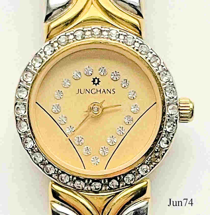 A Junghans ladies dresswatch attached with small zirkonia on the dial and around the watch rim. Also equipped with a silver/gold coloured metal band. Signed front: “Junghans”, back: “Base Metal Bezel, Stainless Steel Back, Water Resistant 30 M, Quartz, 47 5961”, inside: “PUW W.Germany, 510, Unadjusted, Four 4 Jewels”