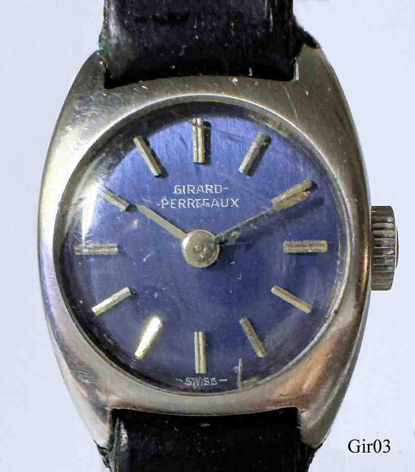 Eine sehr zierliche Girard-Perregaux Damen Handaufzugsuhr im Edelstahl Gehäuse. Blaues Zifferblatt, Beschriftung vorn: “Girard-, Perregaux, -Swiss-”, hinten: “9139 FA”,innen: “650167, 17 Jewels, Swiss, Girard- Perregaux”, inside back: “Stainless steel, Girard-Perregaux, 1791, Swiss, GP Logo”. Schwarzes Lederarmband mit GP Schließe. Uhrwerk GP Z81