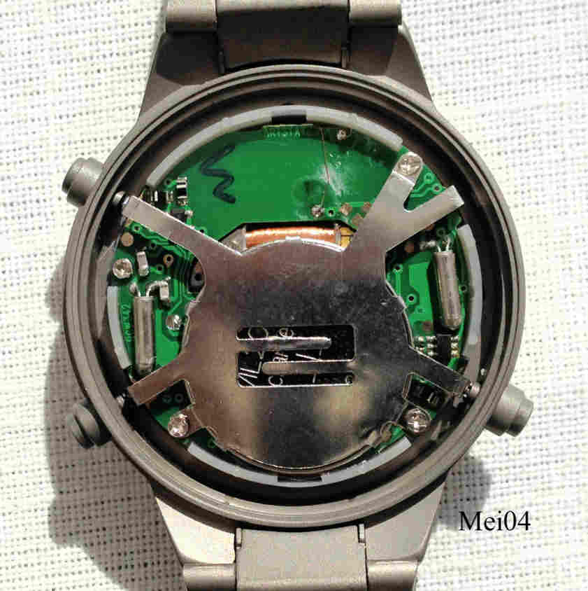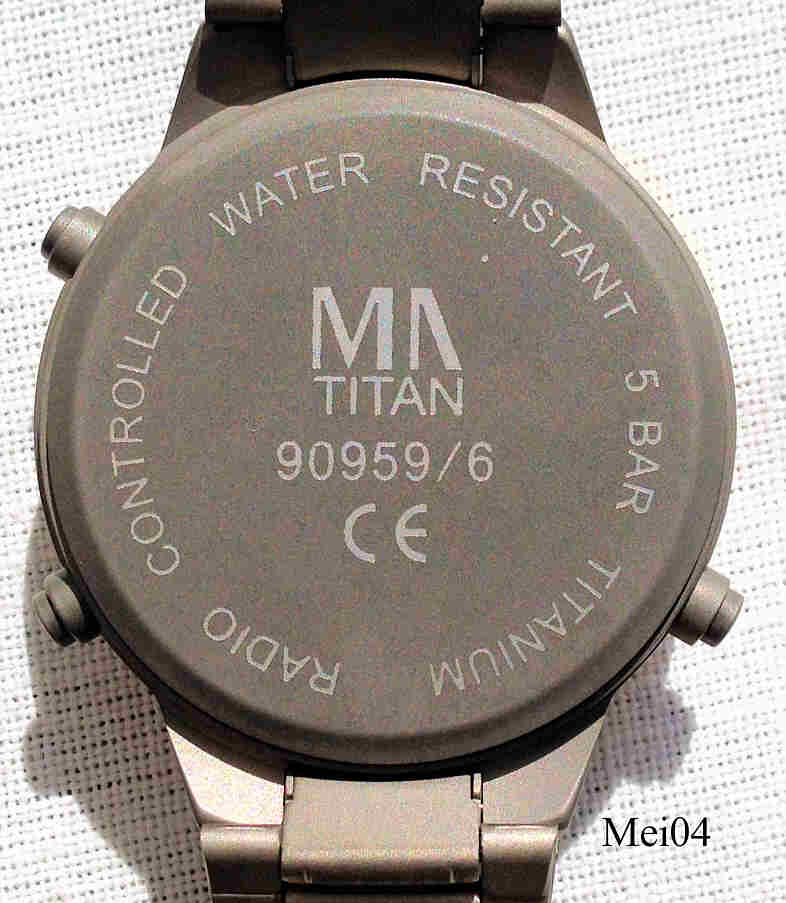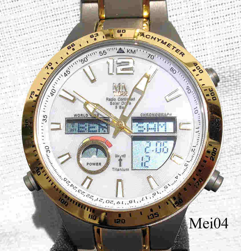 Eine sehr schöne Funk Solar Uhr der Firma Meister-Anker mit Analog und Digitalanzeige. Digitalanzeige zeigt die Weltzeiten, Chronographenfunktionen und Ladezustand. Ewiger Kalender, Weltzeit 38 Städte, Stoppuhr, Sleepfunktion, Überladeschutz, Dunkelgangreserve bis zu 6 Monate. Das Gehäuse ist aus Titan, Beschriftung vorn: “MA, Radio Controlled, Solar Drive, 5 Bar”, innen: ”RCW342, Artstar”, hinten: “Radio Controlled, Water Resistant, 5 Bar, Titanium, MA Titan, 90959/6, CE”. Titan Gliederarmband, Caliber W342.