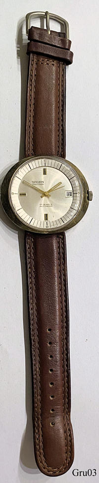 Eine schöne Gruen Precision Automatic Uhr. Base Metal Gehäuse in goldfarben mit braunem Lederarmband. Schweizer Werk, Kaliber 730CA, Inschrift vorn: ”Gruen, Precision, 17 Jewels, Autowind, Swiss”, hinten: ”Gruen Precision, Swiss Made, Base Metal Bezel, Stainless Steel Back”, innen: “Gruen Watch Co., 730CA, Precision”