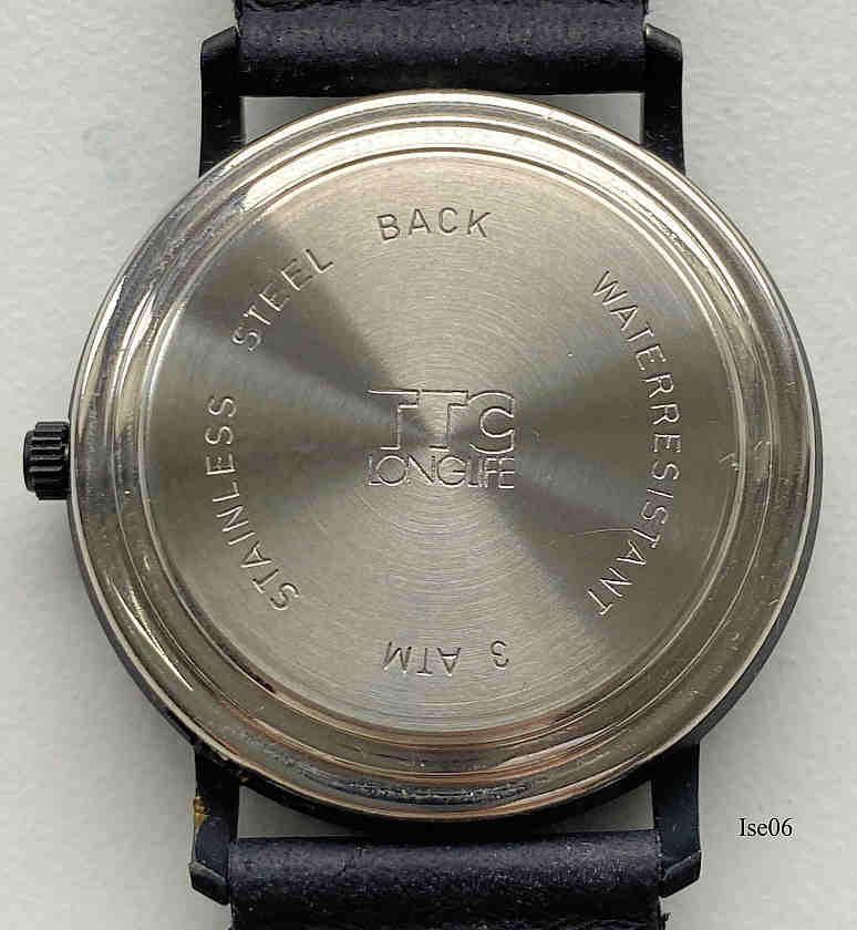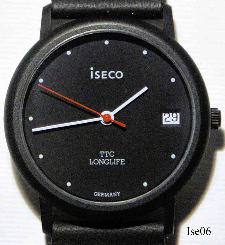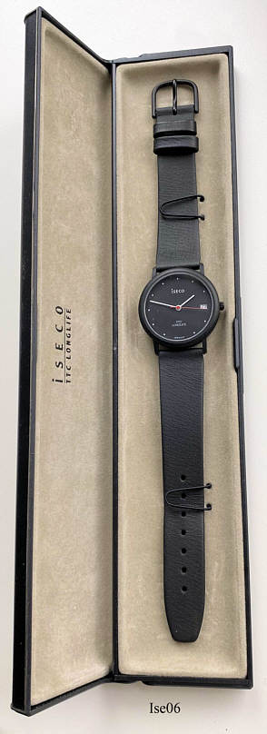 Eine Iseco Uhr mit klarem schwarzem Zifferblatt, Datum bei der 3. Beschriftet vorn: ”Iseco, TTC, Longlife, Germany”, hinten: “Stainless Steel Back, Water resistant 3 ATM, TTC Longlife”, innen: “EBOSA Bluebird, Ebosa S.A. One 1 Jewel, CE, 700.701, Vers.2, LZU4”. Longlife bezieht sich auf die Lithium Jod Batterie, die die Uhr Garantiert 20 Jahre antreiben soll. Die ganze Rückwand ist die Batterie. Kaliber Ebosa LZU4.