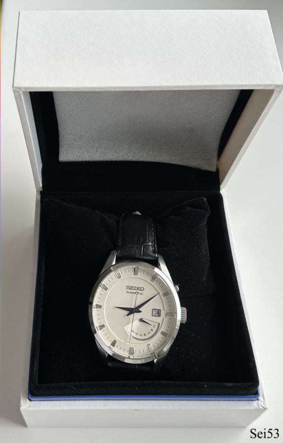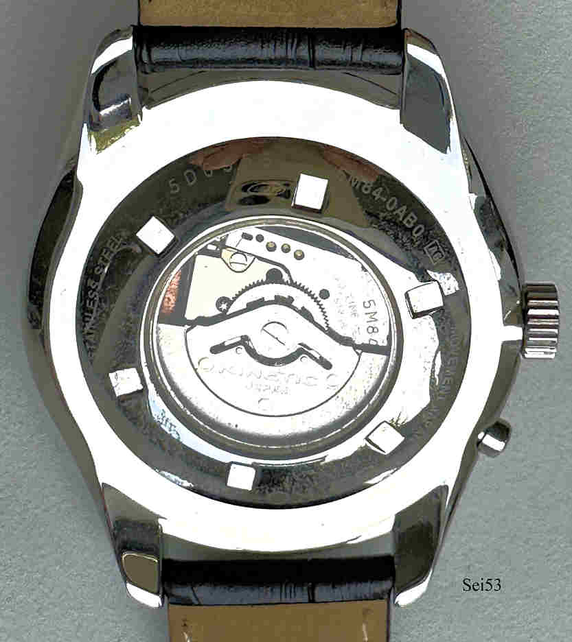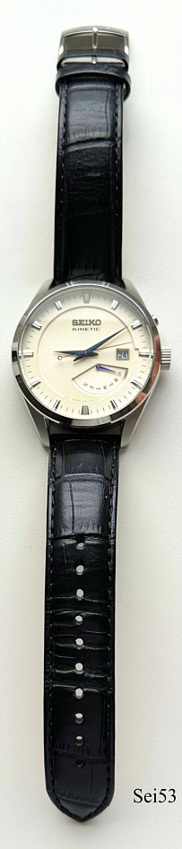 A Seiko Kinetic watch with stainless steel case. A Generator generates, driven through an automatic weight, the energy to load a condensator. This condensator then drives the quartz movement. Signed front: ”Seiko, Kinetic”, back: ”Seiko Water Resistant 10 Bar, Stainless Steel, 5D0355, 5M84-0AB0, Movement Japan”, inside: “5M84A, Seiko Time Corp. Japan, Six 6 Jewels, Seiko, Japan”. Brown leather band.