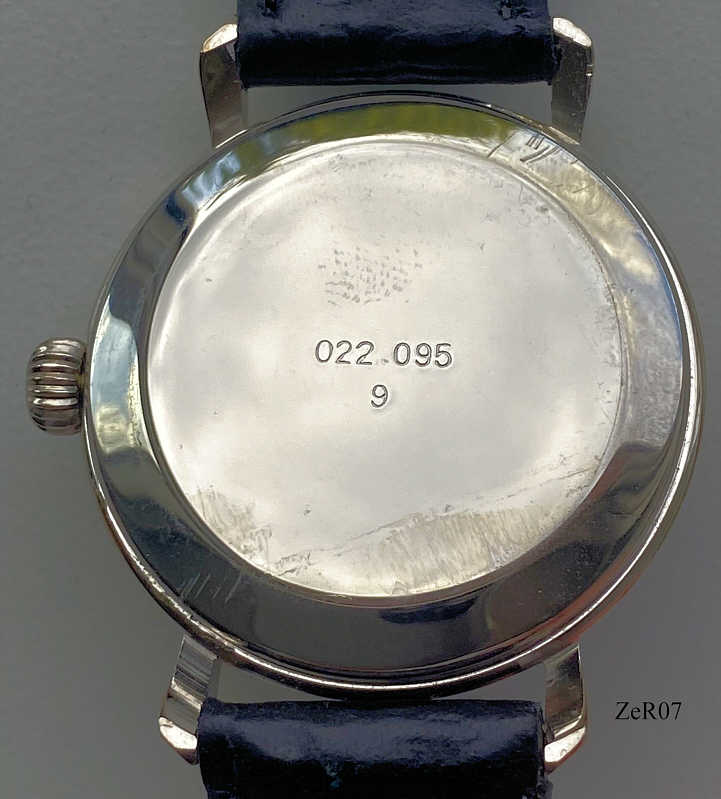 A ZentRa watch with Miyota quartz movement. Stainless Steel case with Onion crown and black leather band. Case Nr.: 022096. Signed front: “ZentRa, Quartz”, back: “022096, 9“, inside: “6L45, Miyota Co.”