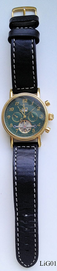 Diese Automatic Uhr von Lindberg&Goldmann, Modell Baron, hat einen Glasboden, ein Automatic Werk und ein interessantes Zifferblatt. Großdatum bei der 12, Monatsanzeige bei der 3, offene Unruh bei der 6, Wochentag bei der 9. Großes goldfarbenes Gehäuse. Beschriftung vorn: ”Lindberg & Goldmann, Automatic”, hinten: ”All Stainless Steel, 5 ATM Water Resistant, Lindberg & Goldmann”. Dunkel grünes Lederarmband.