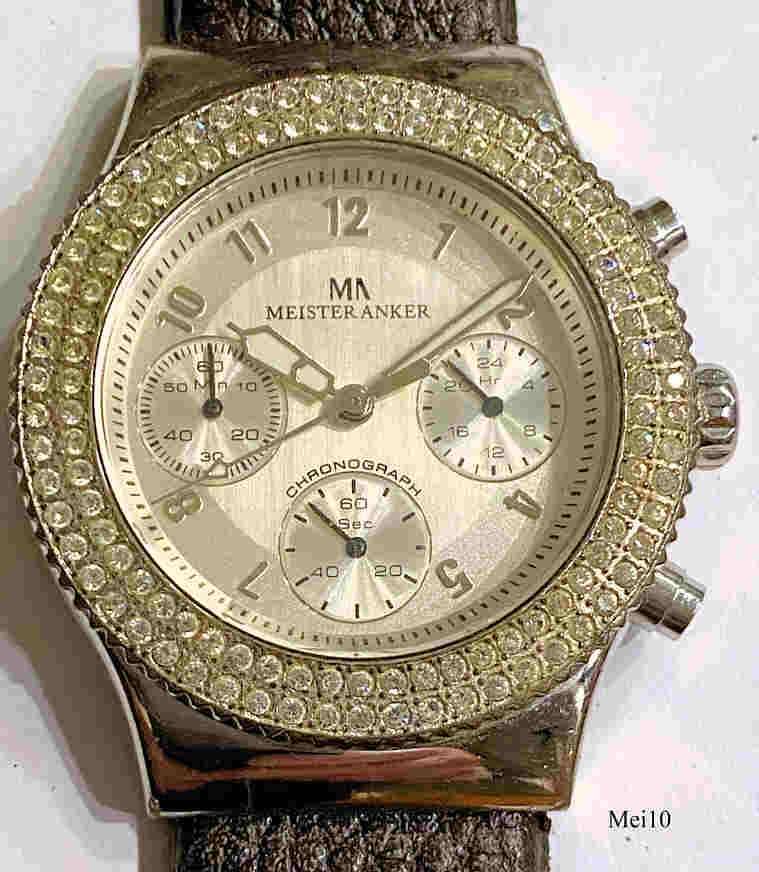 Ein Damen Chronograph mit einem doppelten Schmuckstein Rand der Marke Meister-Anker mit Quartzwerk. Das Gehäuse ist aus Base Metal. Beschriftung vorn: “MA, Meister Anker, Chronograph”, innen: ”SIIO, No Jewels, Japan, VD54B”, hinten: “Stainless Steel Back, Water Resistant, MA, Meister Anker, 707.006, 3/259”. Uhrwerk Kaliber SIIO VD54B.