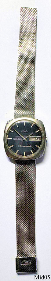 This is a Mido Ocean Star DatoDay Chronometer, Mido Caliber 1147 OCD (As 1831?), Stainless Steel case, Day/Date at 3. Signed front: ”Mido, Ocean Star, Datoday, Chronometer, Swiss Made”, back: ”6435903, Stainless Steel, Swiss Made, 5519”, inside: ”Mido, Swiss Limited, Cal. 1147 OCD, 19800, Adjusted to six (6) Positions + Temperature, Seventeen 17 Jewels”, Milanaise band with Mido clasp.