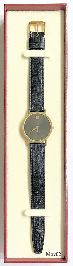 Das klassische Design der Movado Museumsuhr wurde 1947 vom Americanischen Künstler Nathan George Horwitt entwickelt. Das Motto war: Ein schwarzes Zifferblatt mit einem solitären goldenen Punkt bei der 12, der die Sonne am Mittag symbolisiert. Die Zeiger stehen für die Bewegung der Erde. Diese Uhr ist dem Original Design sehr nahe. Beschriftet vorn: “ Swiss Movado Quartz”, hinten: “87-45-882, 1086082”, innen: “ Movado, Seven 7 Jewels, 032,042,Swiss V8, ETA 956.032 “