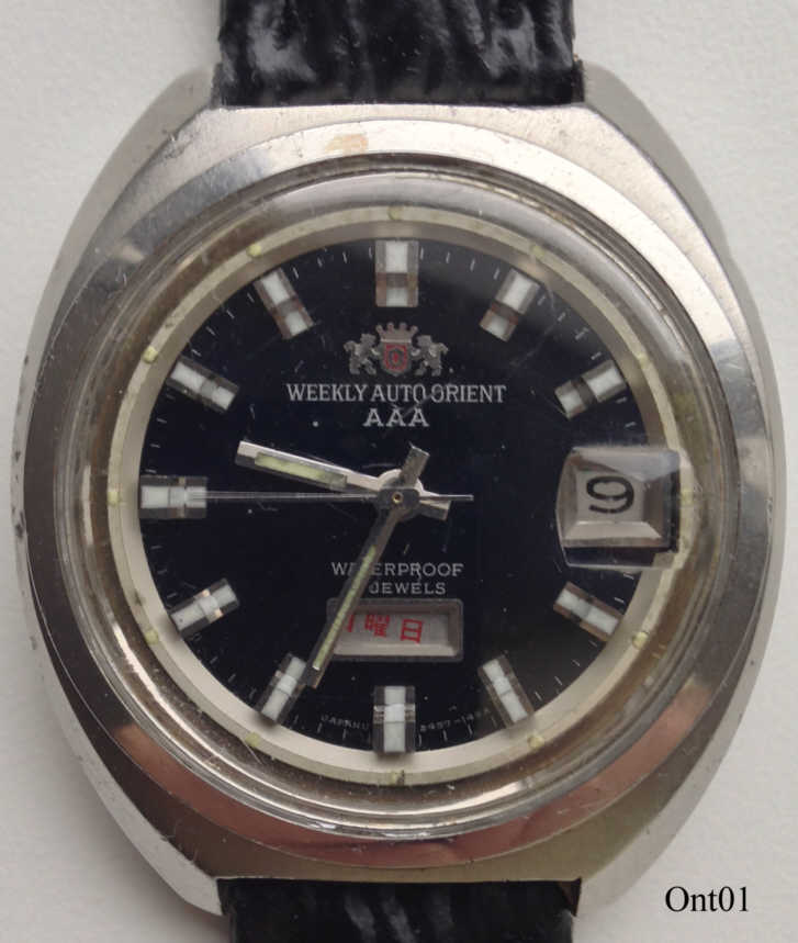 This Orient Weekly Automatic watch has been designed for the far east area. Date at 3 with a lens in the glasand month at 6.Signed front: “Weekly Auto Orient, A.A.A, Waterproof, 21 Jewels”, back: “40M Waterproof, Stainless Steel, Antishock, H114957, Weekly Auto Orient”, on the swing: “21 Jewels, 1942, Orient Automatic”, black leather band.