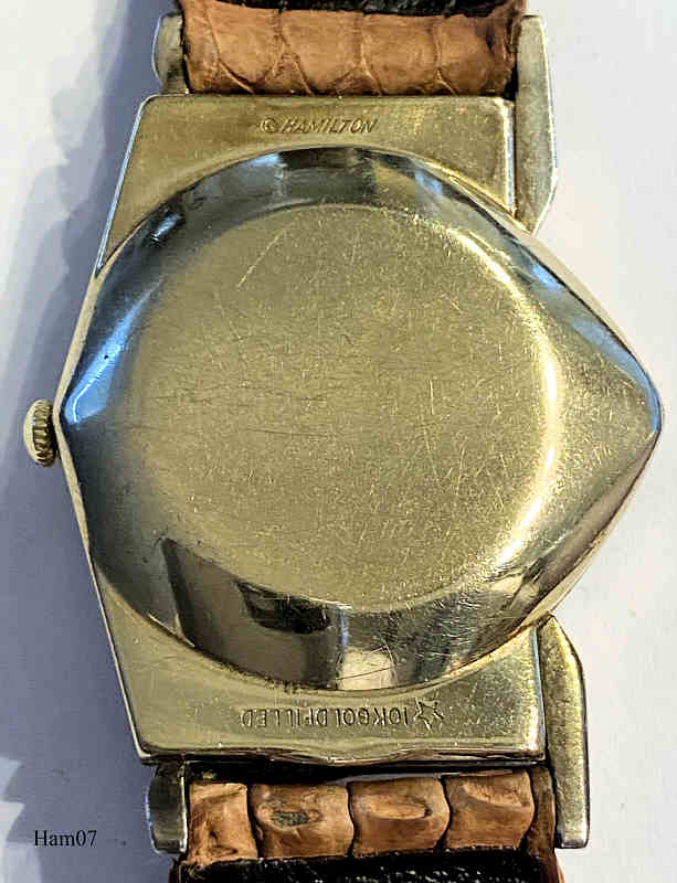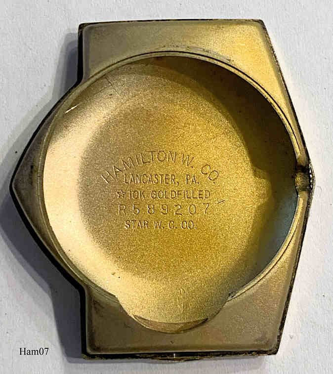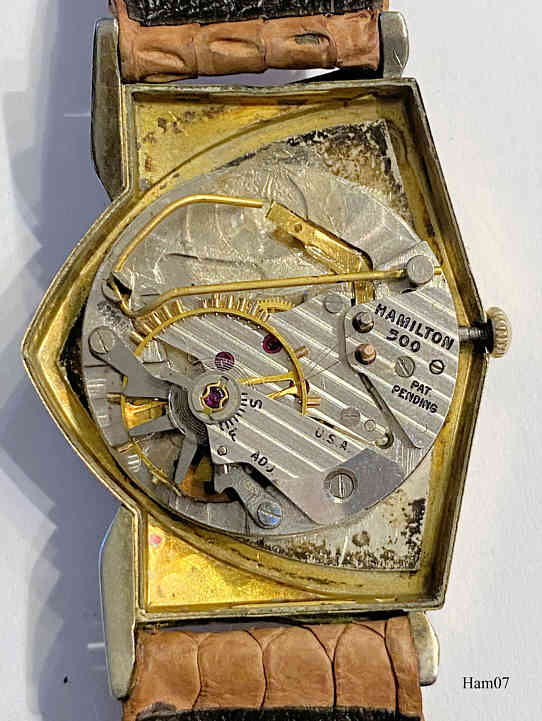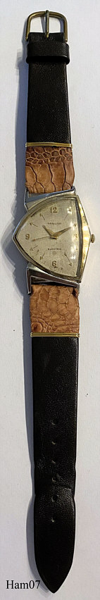 Diese Hamilton Pacer ist aus dem Jahre 1957 und wird durch ein Caliber 500A getrieben. Beschriftet vorn: “Hamilton, Electric, Pat. Pending”, hinten: ”10K gold filled, Hamilton”, innen: “Hamilton, 500, patented, U.S.A.”, Rückwand: “Hamilton W. Co., Lancaster PA., 10K gold filled, R589207, Star W.C. Co.”. Die Besonderheit dieser Uhr ist die asymetrische dreieckige Form, eine moderne Entsprechung in Erinnerung an dieses Design wurde von Seiko sowie später auch von Graf von Monte Wehro angeboten. Auch Hamilton vertreibt inzwischen moderne Versionen dieses Designs.