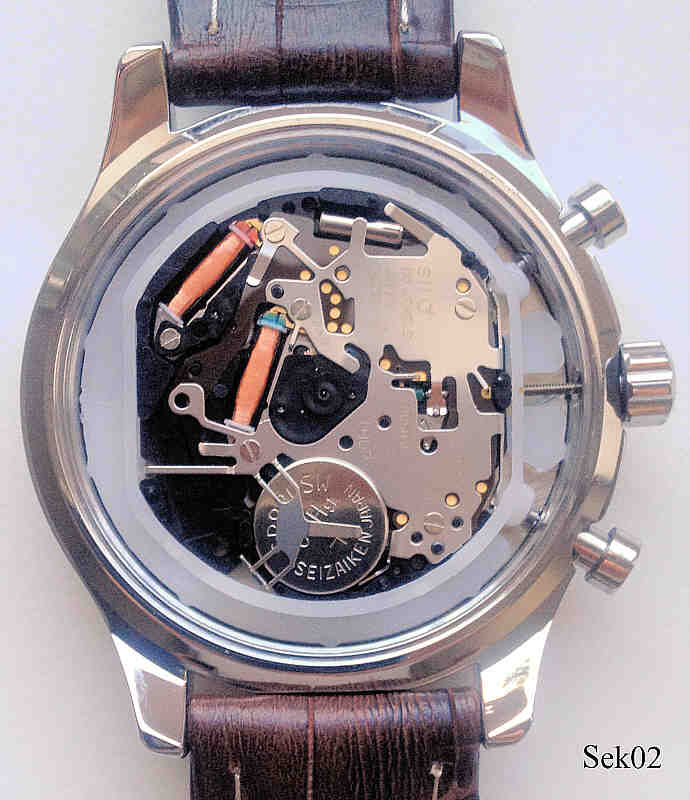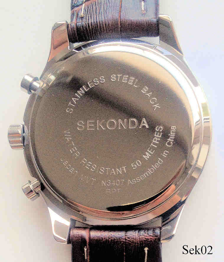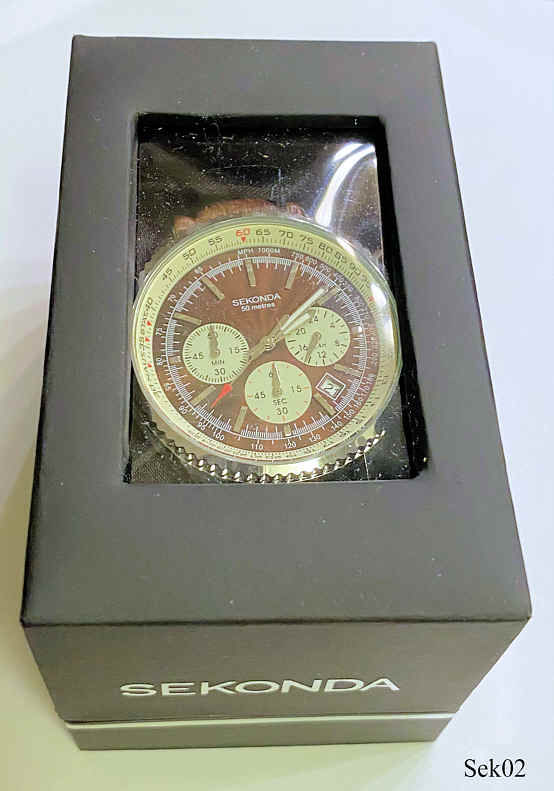 Ein Chronograph der Firma Sekonda im Piloten Look mit braunem Lederband. Beschriftet: “Sekonda, 50 Metres”, hinten: ”Stainless Steel Back, Sekonda, Water Resistant 50 Metres, Japan Mvt, N3407, Assembled in China, BPT”, innen: ”SIIO, No Jewels, Japan”. Das Werk ist ein SIIO Kaliber VD53B. Datum bei der 4. Gekauft auf dem Rückflug von Dublin.