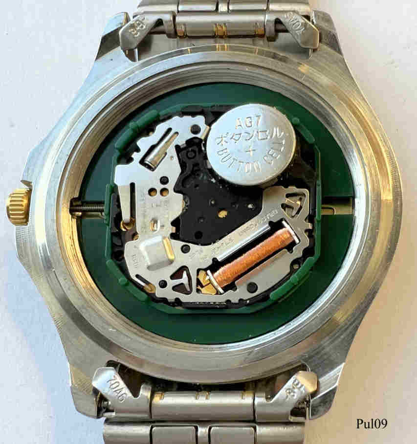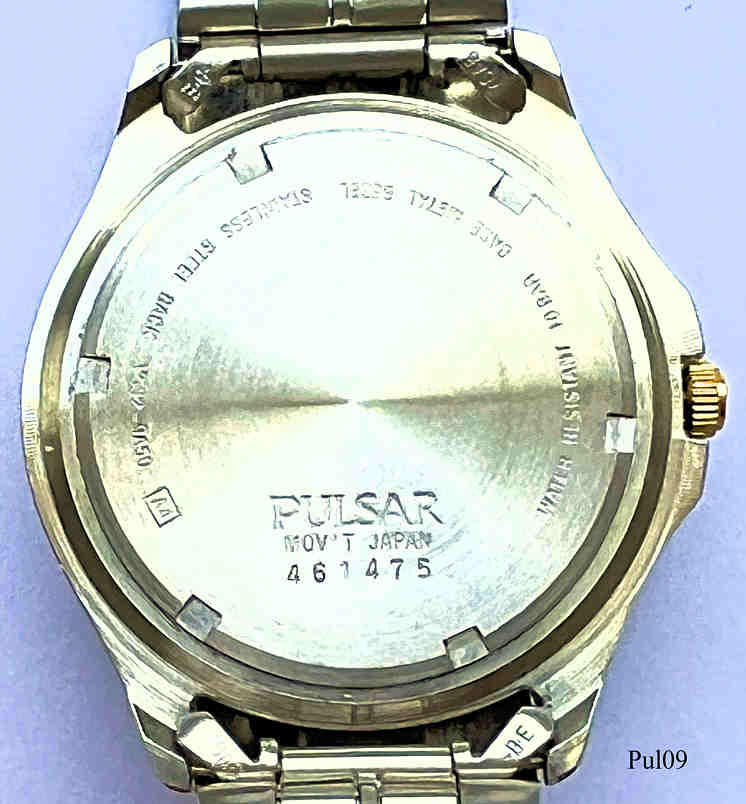 Eine Pulsar Herren Quartzuhr mit cremefarbenem Zifferblatt und goldenen Balken als Ziffern, Datum bei der 3. Beschriftet vorn: “Pulsar, Quartz, Water Resist 100M”, hinten: ”Pulsar, Mov’t Japan, 461475, Water Resistant 10 Bar, Base Metal Bezel, Stainless Steel Back, V532-9A50 A4”, innen: ”Shiojiri Ltd., 2, V532A, Japan, No Jewels, Unadjusted”. Kaliber Shiojiri Y532A. Base Metall Gehäuse mit goldenem Ring, Edelstahl Glieder Band mit Goldstreifen..