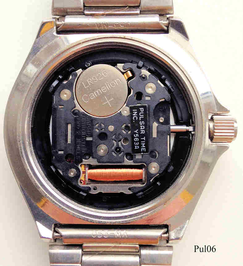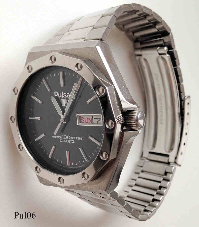 Dies ist eine Pulsar Quartz Uhr mit schwarzem Zifferblatt und Day/Date bei der 3. Beschriftung vorn:” PULSAR, Water Resist 100, Quartz”, hinten:” Water resist, Stainless Steel, Y563-8349 A2, 1N0217, PULSAR“ Edelstahl Gehäuse mit Edelstahl Armband. Kaliber Pulsar Y563A, Tag und Kalender bei der 3.