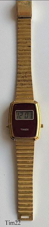 A Timex LCD watch. Signed front: ”Timex, back: ”Timex F Cell, Base Metal Bezel, Stainless Steel Back”. Inside: ” , inside the Back: ”Case, Great Britain, Timex”. On the inside left of the IC you see the transparent capsuled tuning fork quartz.