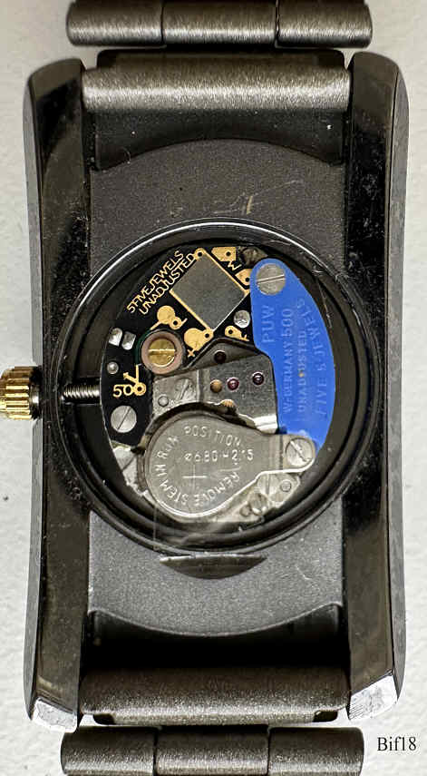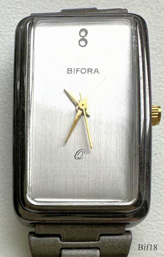 This is a Bifora ladies quartz watch, using a PUW 500 movement and relates to the India manufacturing. Gun metal case, white dial, two points at twelve with central seconds hand. Signed front: ” BIFORA, Q”, back: ” ”, inside: “Unadjusted, PUW 500, five (5) Jewels”. Integrated titanium metal band.