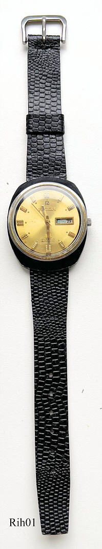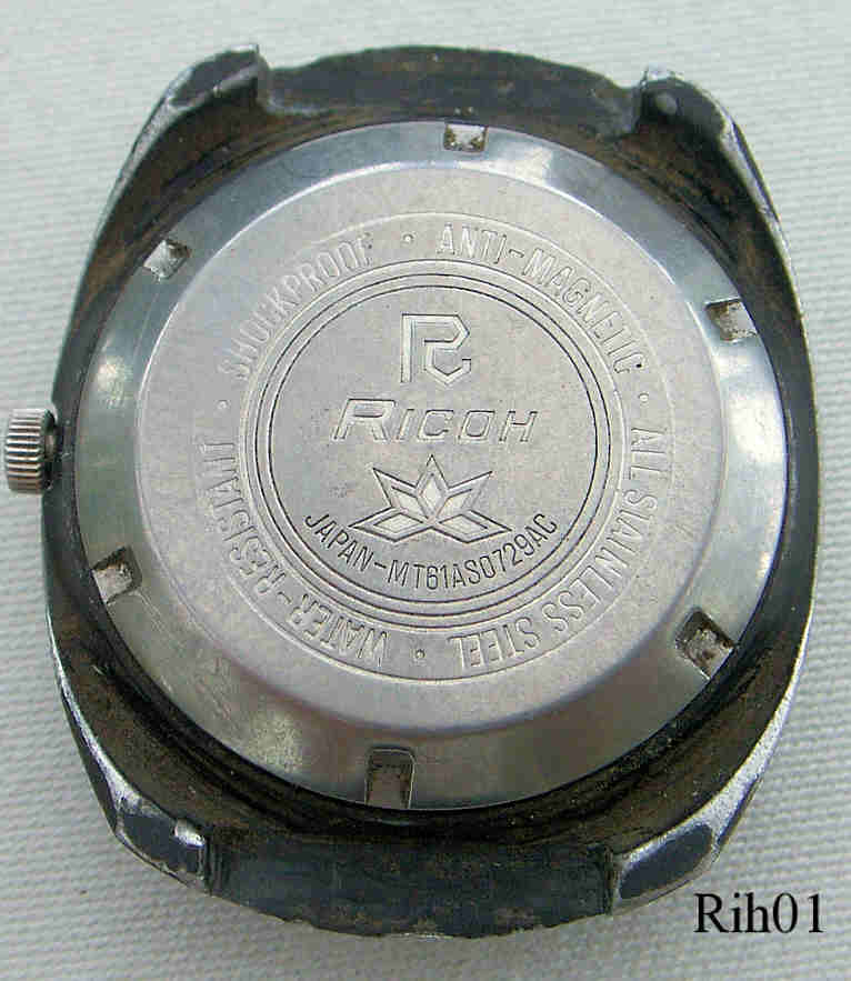 Dies ist eine Automatic Uhr mit Day Date bei der 3 von Ricoh. Der Tag wird als Wort und als Zahl ausgegeben. Beschriftung vorn: ”Ricoh, 21 Jewels, Automatic”, hinten: ”Ricoh, Antimagnetic, All Stainless Steel, Water Resistant, Shockproof, Japan, MT61AS0729AC” auf dem Automatic Gewicht: ”Ricoh, Auto, 21 Jewels”