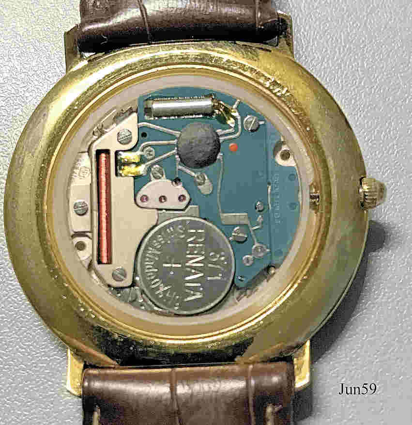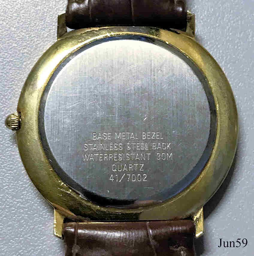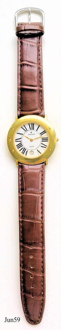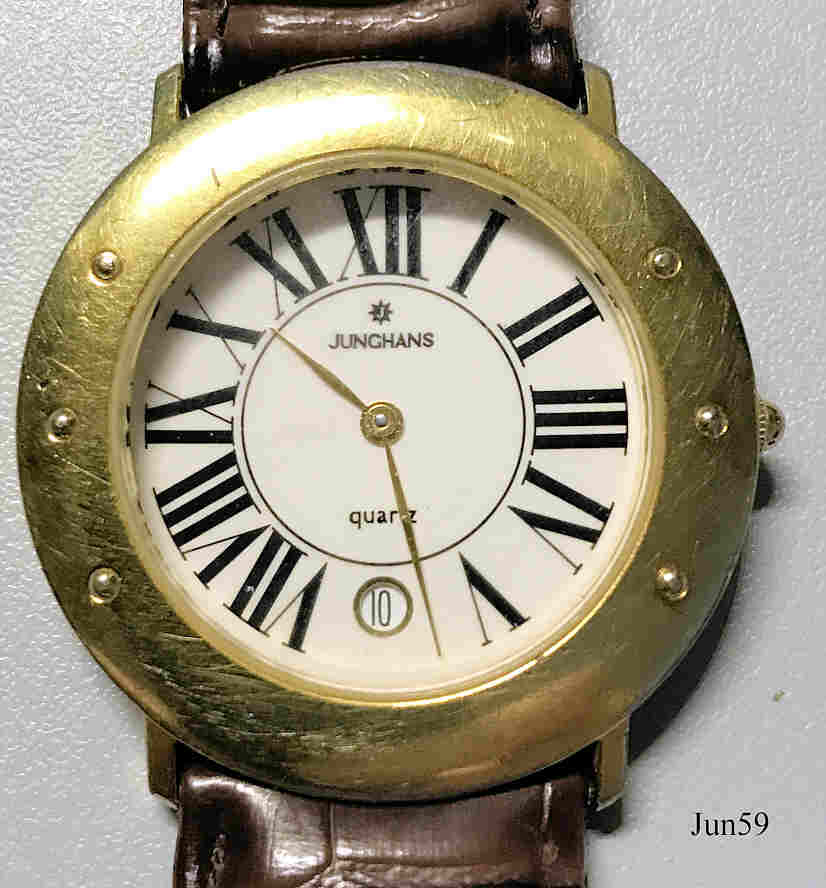 Eine Junghans Schmuckuhr mit weißem Zifferblatt und starken römischen Ziffern. Beschriftet vorn: ”Junghans, Quartz”, hinten: ”Base Metal Bezel, Stainless Steel Back, Water Resistant 30M, Quartz, 41/7002”, innen: “ETA, 955.414, Seven 7 Jewels”, Braunes Lederarmband , Werk ETA 955.414