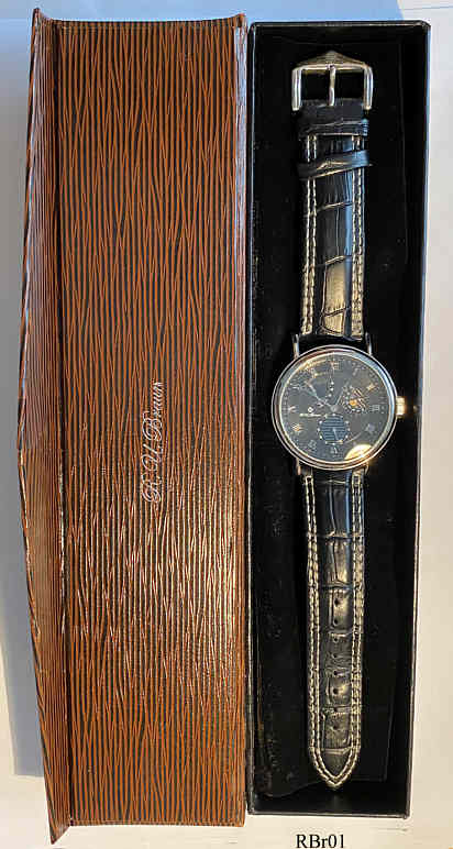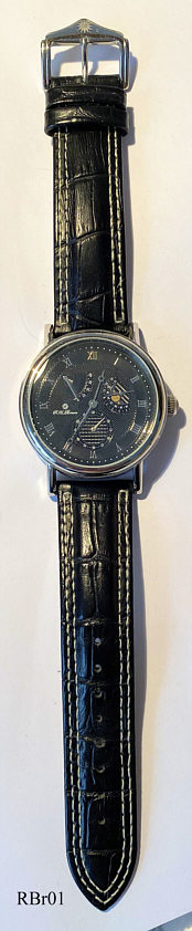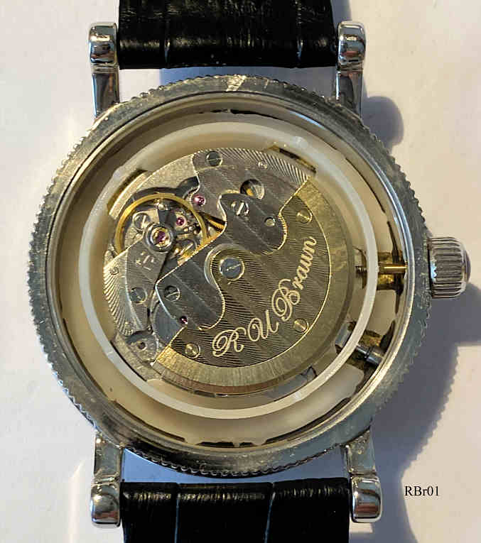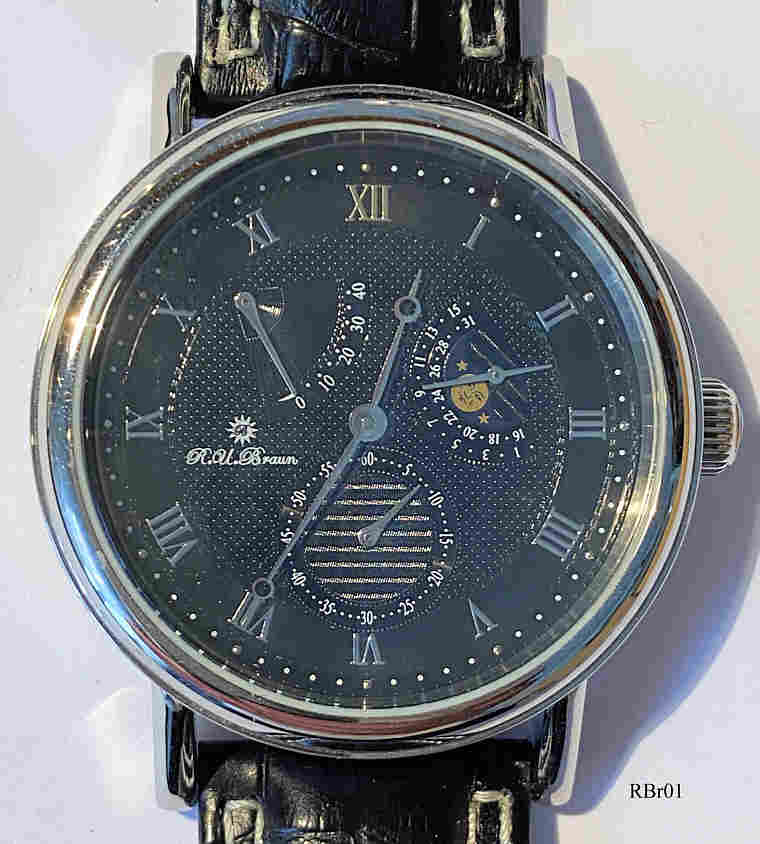 Diese Automatic Uhr von R.U. Braun hat einen Glasboden, ein Automatic Werk und ein ganz ungewöhnliches guillochiertes Zifferblatt. Es gibt eine Anzeige für die Gangreserve, eine Anzeige für das Datum in Halbkreisform mit einem langen und einem kurzen Zeiger sowie eine Sekundenanzeige. Großes Edelstahl Gehäuse, Krone mit blauem Cabouchon. Beschriftung vorn: ”R.U.Braun”, hinten: ”5ATM Water Resistant, 28 Jewels, Automatic, RUB 03-0014” auf dem Automatic Gewicht: ”R.U.Braun”