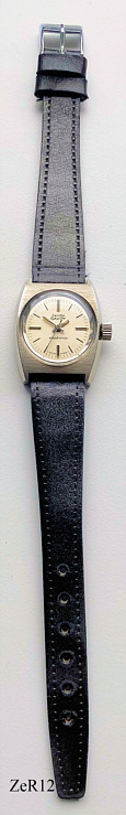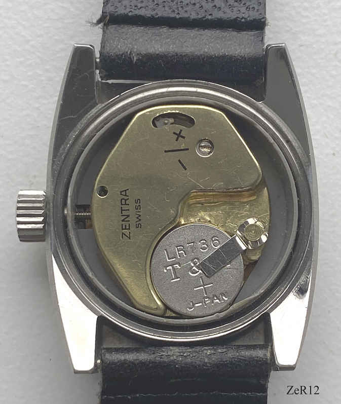 Eine schöne ZentRa Electric Damen Uhr mit einem ESA 9200 Werk. Edelstahl Gehäuse mit schwarzem Lederarmband. Beschriftet vorn: ”ZentRa, Savoy, Electronic, Swiss Made”, hinten: ”Waterresistant, Incabloc, Stainless Steel, Swiss Made, 54-7.045-9071, Electronic, 638”, innen: “Seven 7 Jewels, Unadjusted, Swiss, ESA 9200, Funtronic”.
