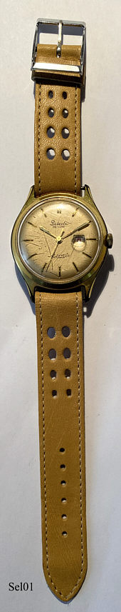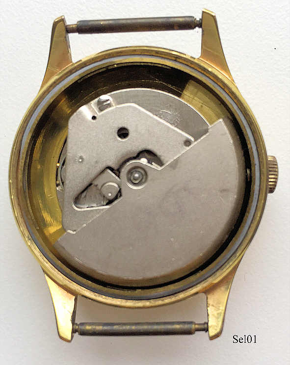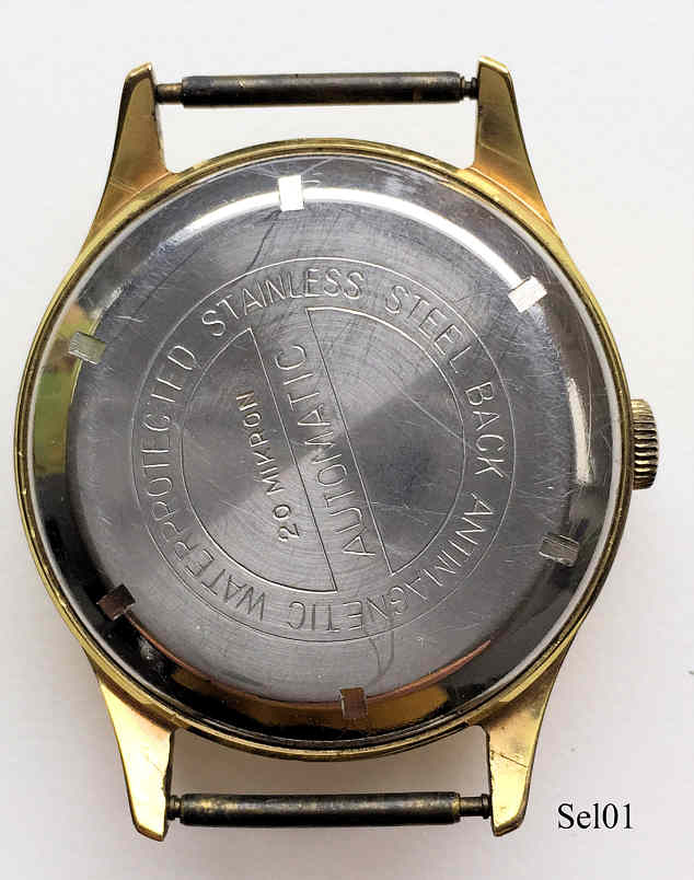 Diese Selecta Automatic Uhr ist wohl aus einer Handaufzugsuhr zur Automatic geändert worden. Der automatische Aufzugsmechanismus ist eine extra Einheit, die auf das normale Werk aufgesetzt wurde. Beschriftung vorn: ”Selecta, De Luxe, 25 Jewels, Automatic”, hinten: ”20 Micron, Automatic, Antimagnetic, Water Protected, Stainless Steel Back”, innen: “AHS 154” Kaliber (Alfred Hirsch Schwenningen) AHS 154.
