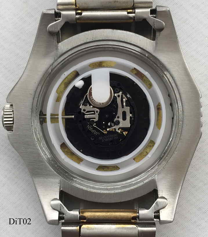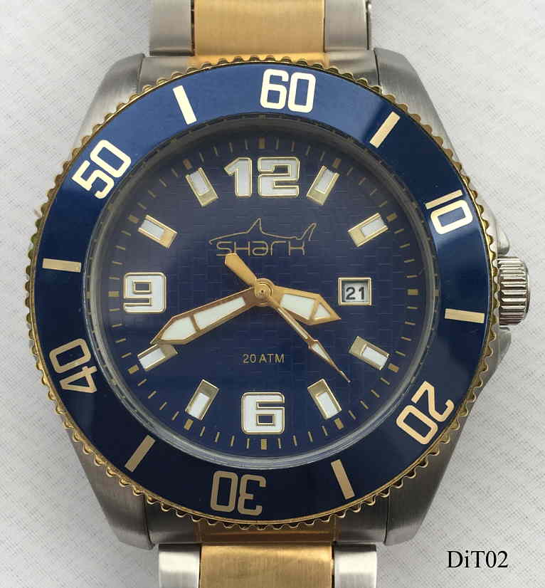 A DigiTech Shark quartz divers watch in stainless steel case, blue dial with large luminous numbers, blue rotating chapter ring. Signed front: “Shark,20 ATM”, Inside:”SIIO, PC32A, No Jewels, Unadjusted, Japan”, back: ”All Stainless Steel, 20 Bar Water Resistant, DigiTech, 2-TV8012”, Caliber SIIO PV32A. Date at 3. Stainless Steel band, screw-on crown.