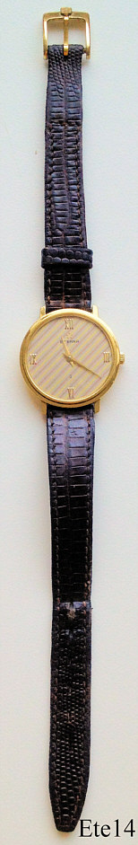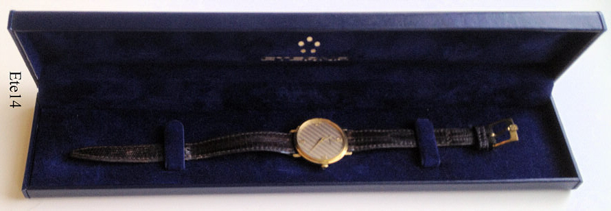 Dies ist eine Eterna Quartz Damenuhr, Kaliber ETA 956.032, Referenz Nr.: 121 6129 25 A, vergoldetes Gehäuse, Edelstahlboden, Mineral Glas. Bezeichnung vorn: ”Eterna, Q”, hinten: ”121 6129 25 A”, innen: “Eterna, Unadjusted, Seven 7 Jewels, Swiss V8, 956.032”. Auf dem Goldrand hinten: “Plaque G20” und “ERG” im Rhombus. Schwarzes Kroko Armband mit Eterna Schließe.
