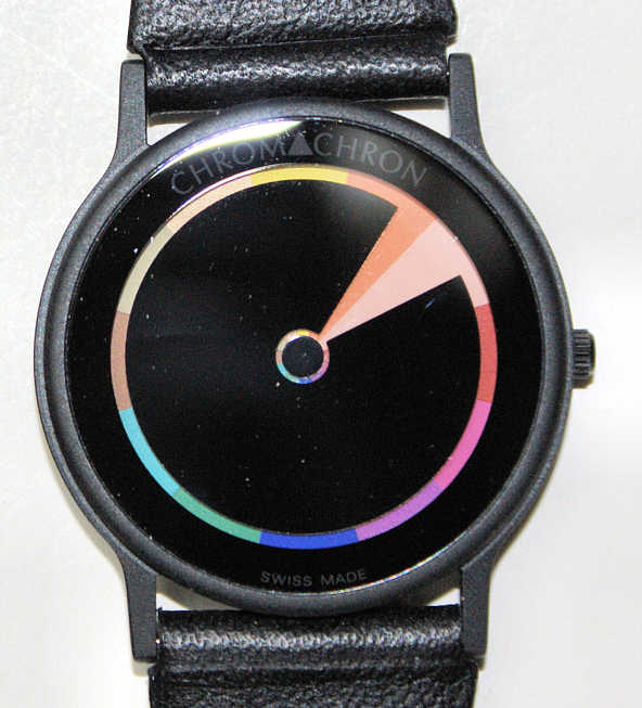 Eine sehr schöne Farbzeituhr von Chromachron, Edition Tian Harlan. Design-Klassiker aus dem Hause Pierre Cardin, gestaltet nach Originalentwürfen von TIAN HARLAN. Das schwarze Gehäuse ist aus Base Metal. Beschriftung vorn: “Chromachron, Swiss Made”, innen:”AV, ISA 368, 1 One Jewel, Unadjusted”, hinten: “Edition Tian Harlan, Chromachron, Swiss Pat. Nr. 613 587, Ref: No CC III - URO 10, 20 M Water Resistant, Swiss Made Quartz”. Uhrwerk Kaliber ISA 368. Schwarzes Lederarmband