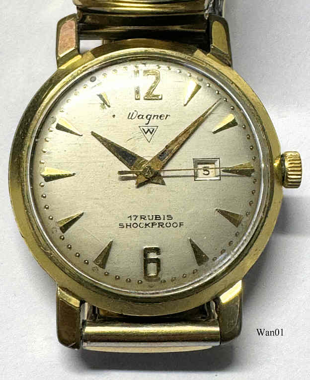 Eine Herren Handaufzugsuhr der Ernst Wagner OHG, Pforzheim. Vergoldetes Gehäuse, Kalender bei der 3. Beschriftet vorn: ”Wagner, 17 Rubis, Shockproof”€¯, hinten: ”Stainless Steel Back, Shockabsorber, Water Protected”¯, innen: ”17 Jewels, 44”. Kaliber Wagneer 44, Expandro Flex Band.