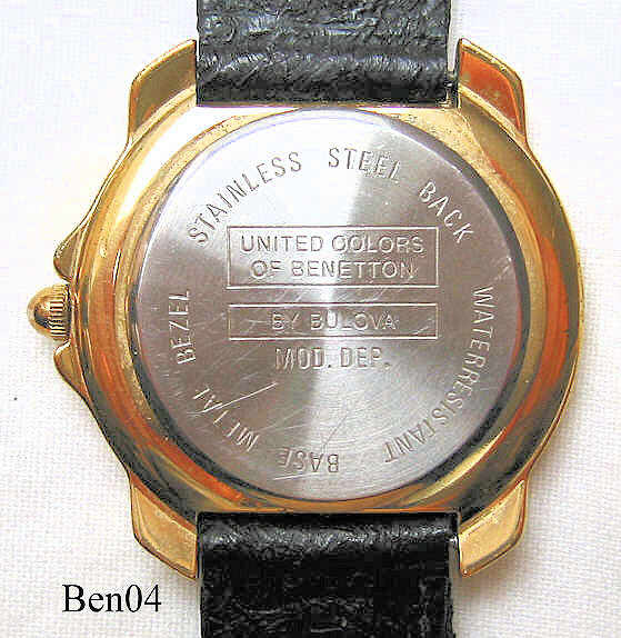 Benetton by Bulova World Time, signed front: ”United Colors of Benetton by Bulova”, back: ”United Colors of Benetton by Bulova, Stainless Steel Back, Water Resistant, Base Metal Bezel, Mod. Dep.”, inside: ”Swiss parts, one Jewel, Assy in Thailand”, black Leather strap with neutral clasp.