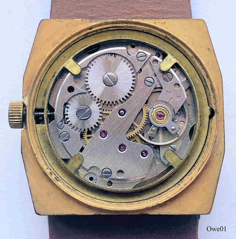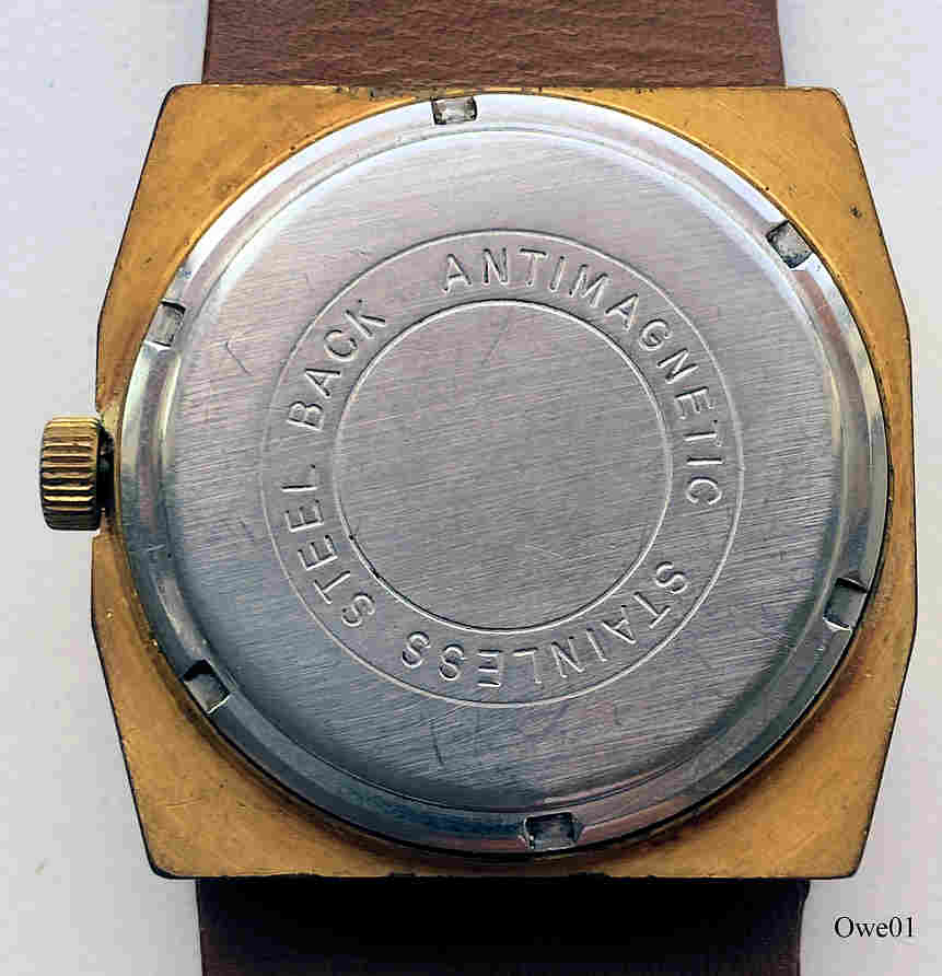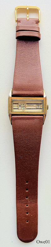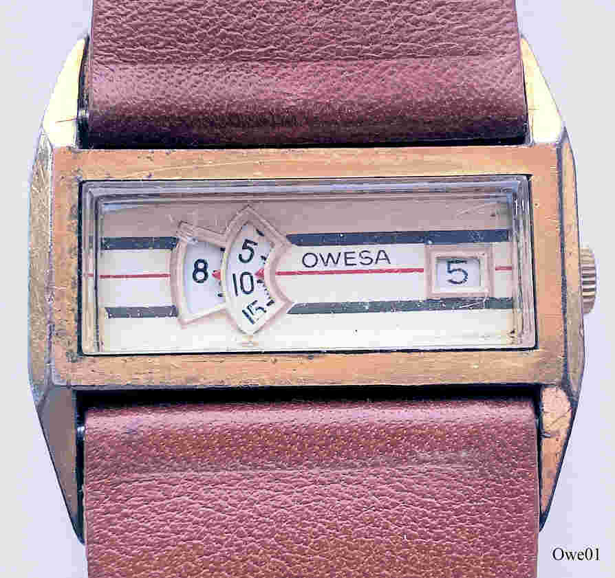 Dies ist eine Owesa Digitaluhr mit Handaufzugs Kaliber mit Datum, statt der Zeiger drehen sich drei Scheiben: Datums-, Stunden- und Minutenscheibe. Datum und Uhrzeit werden dann in zwei Fenstern abgelesen. Besonders interessant ist der Ansatz des Armbandes, ein Teil der Uhr wird durch das Armband verdeckt, dadurch erscheint die Uhr sehr schmal. Beschriftet: ”Owesa”, hinten: “Stainless Steel Back, Antimagnetic”. Kaliber France Ebauches 233-69-A Owesa ist eine Marke der Firma Otto Wegemund, Saarbrücken, seinerzeit gehörte das Saarland noch zu Frankreich.