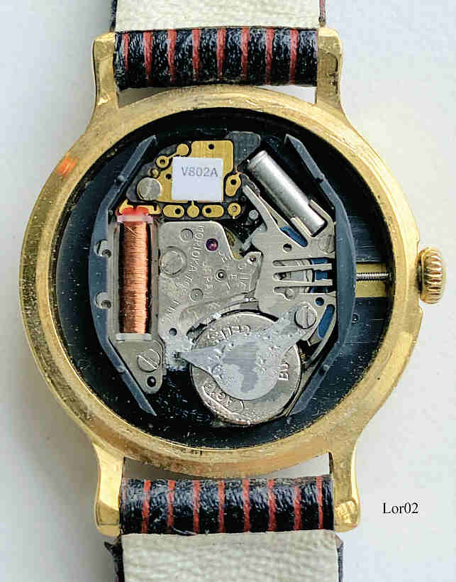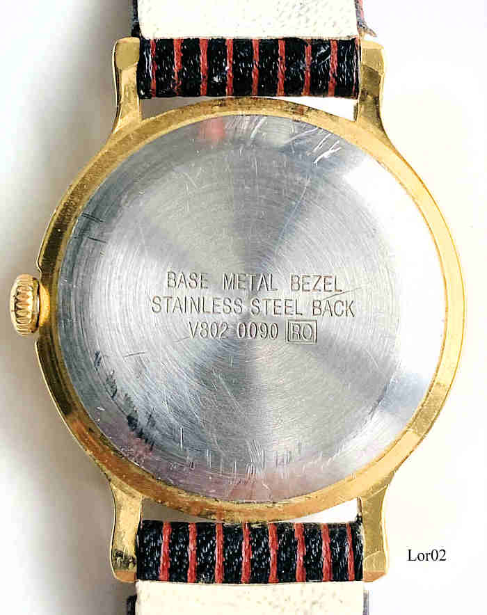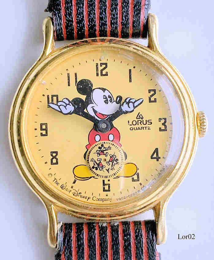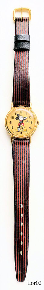 Eine Lorus Mickey Mouse Jungen Uhr im Auftrag von Walt Disney mit einem braun/rot gestreiften Lederarmband. Beschriftet vorne:”Lorus, Quartz, V602-0240 R, Mv’t Japan” hinten: “ Base Metal Bezel, Stainless Steel Back, V802-0090, RB”