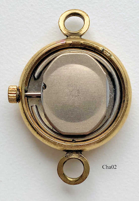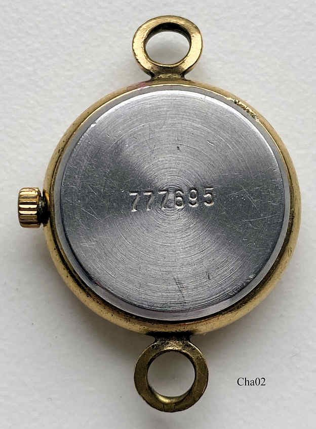 Eine Chaika Damen Quartzuhr mit fester Armbandspange. Base Metal Gehäuse mit Edelstahlboden. Beschriftet hinten: “777695”.