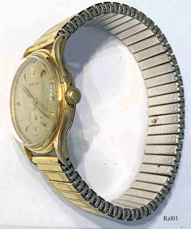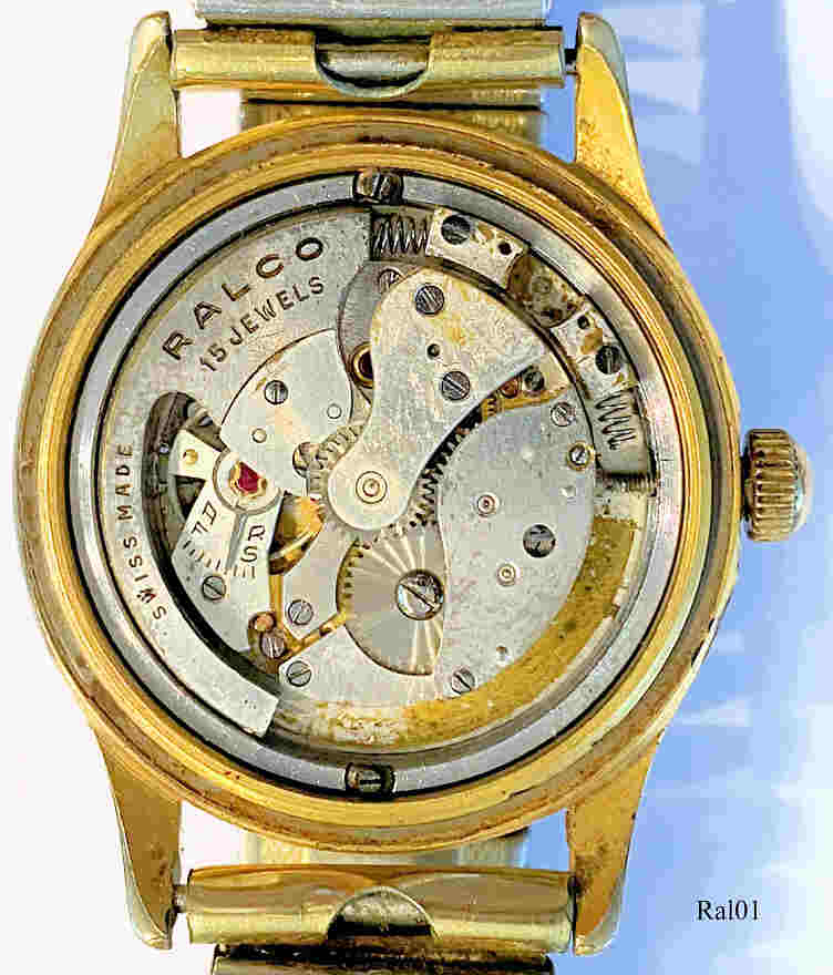 "Ralco" Uhren werden von Movado hergestellt, der Name besteht aus den ersten Buchstaben von drei Mtgliedern der Ditesheim Familie, Roger, Armand and Lucien (Eigentümer von Movado). Eine RALCO Automatic Uhr mit einem frühen Hammerautomatic Werk. Hier ist das Automatic Gewicht nicht als Rotor ausgeführt sondern als Schwinge, die Hin und Her schwingt. Beim Linksschwung wird das Zahnrad zum Aufziehen mitgenommen, beim Zurückschwingen ratscht der Mitnehmer über. Beschriftet vorn: “RALCO, Swiss Made”, hinten: ”Waterproof, Antimagnetic, Shockabsorber, Automatic”, innen: ”RALCO, Swiss Made,15 Jewels”, im Boden: “Stainless Steel, Back, 523076”.