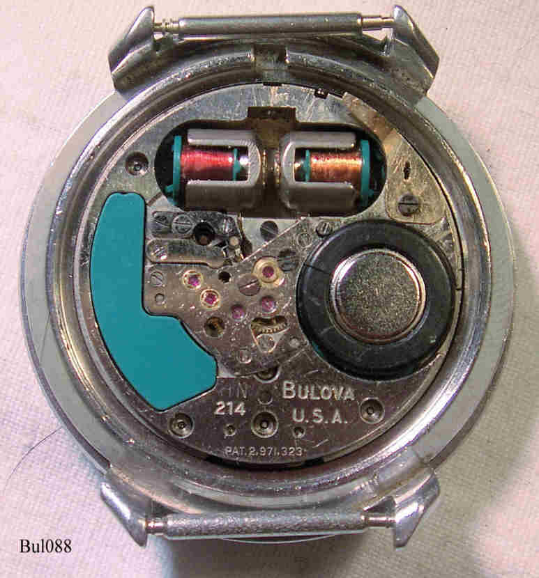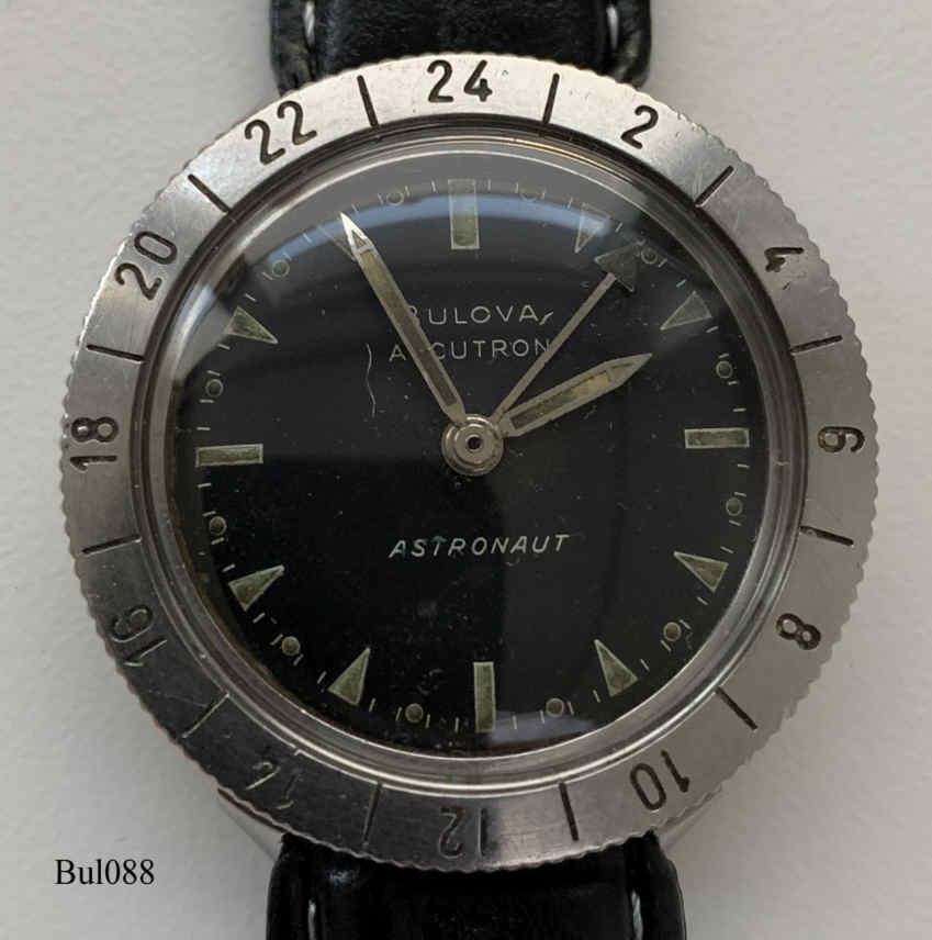Bulova 214 Astronaut with a simple black dial, signed front: ”Bulova, Accutron, Astronaut”, back: “BULOVA, Patented, Stainless Steel, Waterproof, B18732, M6”, inside: “Bulova, 214 HN, USA, Pat.:2.971.323, M6”, Caliber 214HN, Manufacturing date 1966 (M6), screw-on case back, clip lever on the back to adjust the time. The Astronaut has an additional hand to show the 24 hours time or an extra timezone, today it would be called GMT display. Also there is a turnable 24 hours ring around the dial.