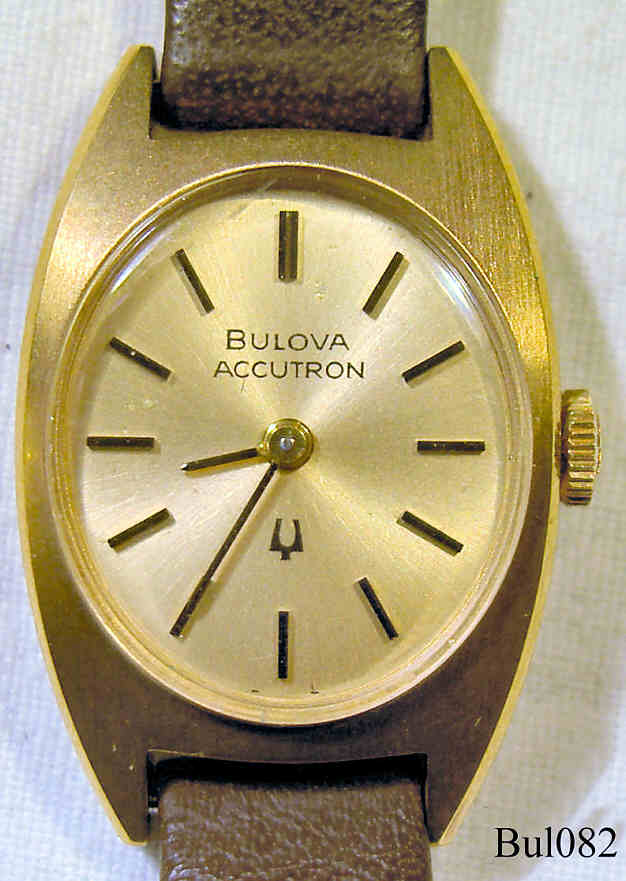 Bulova Ladies Accutron with Stainless Steel Case, signed front: “Bulova, Accutron”, back: “2-776307”, inside: “Bulova, USA, 2210, N3”, Caliber 2210, date of production 1973 (N3), dark brown leather strap.
