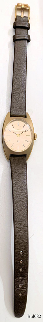 Eine Bulova Damen Accutron mit Base Metal Gehäuse, Beschriftet vorn: “Bulova, Accutron”, hinten: “2- 776307, N3”, innen: “Bulova, USA, 2210, N3”, Caliber 2210, Herstelldatum 1973 (N3), dunkelbraunes Lederarmband.