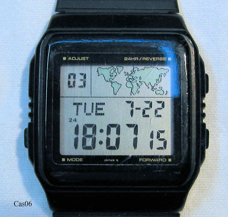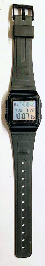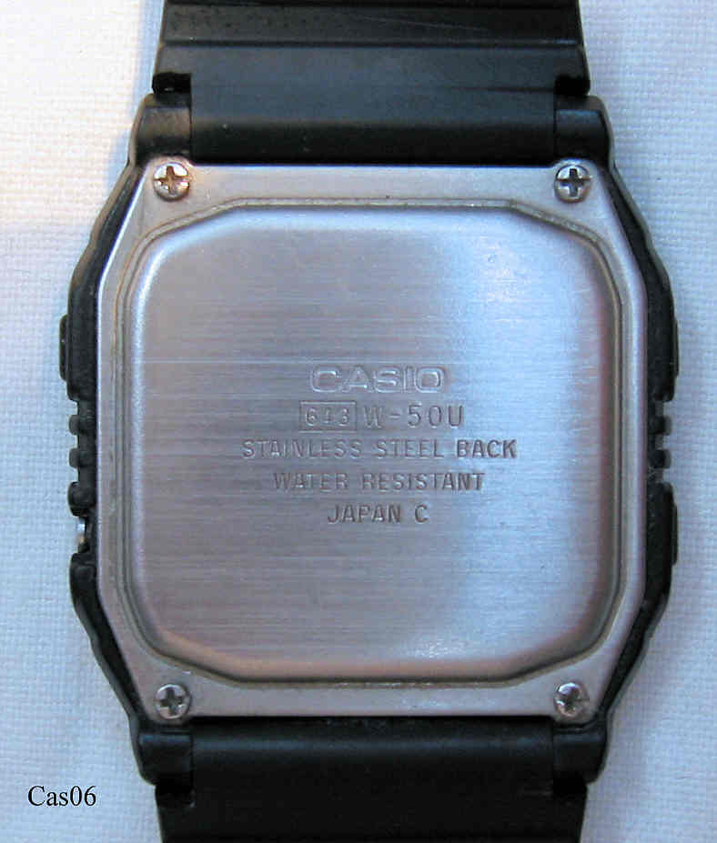 Dies ist eine interessant gestaltete LCD Uhr, die neben den normalen Funktionen wie Datum, Tag, Monat, Jahr sowie Wecker, auf einer kleinen Weltkarte die Zeitzonen anzeigt und durch einen senkrechten Strich die jeweils gewählte Zeitzone hervorhebt. Beschriftung: ”Casio, 643, W-50U, Stainless Steel Back, Water Resistant, Japan C”. Kunststoff Gehäuse, Kunststoff Armband , 3 Volt Batterie 1616, verschraubter Boden.
