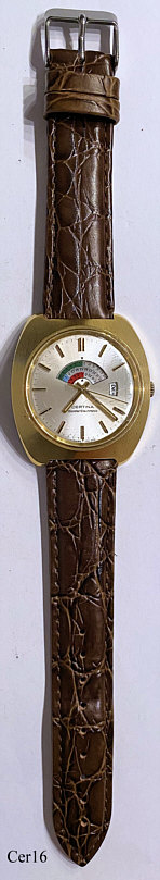 Dies ist eine Certina Biostar Electronic, die einzige elektromechanische Uhr mit Anzeige der Biorhythmus Kurven des Eigentümers. Im Kalenderfenster bei der drei wird der Wochentag als Ziffer angezeigt (Montag ist  1....). Die Uhr muß beim Kauf auf das Geburtsdatum des Käufers eingestellt werden und zeigt dann jeweils den Stand der drei Biorhythmus Kurven auf den Skalen bei der 12 an. Der farbige Teil zeigt die positive Kurve, der silberne Teil die negative Kurve. Werk N° 9074081, Caliber 28-353, ESA 9154. Beschriftet vorn: ”Certina, Biostar Electronic, Swiss LIC ATO”, innen: ”Certina, 28-353, unadjusted”,  hinten: ”7506 001, 9074081”. Vorgänger dieser Uhr war die Biostar.