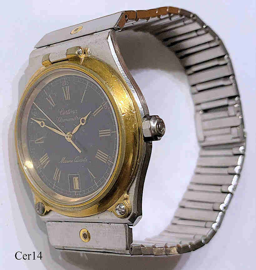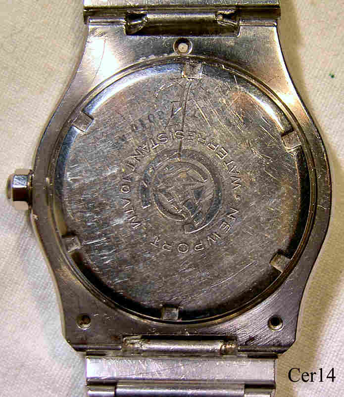 Dies ist eine Certina Newport Quartz Uhr im Nautic Design mit verschraubter Krone, beschriftet: ”Certina, Chronomètre, Marine Quartz, Swiss Made”, innen: ”Seven Jewels, unadjusted, Swiss, V8”, hinten: ”744 3010 40, Water Resistant 10 ATM, Newport”. Gehäuse Edelstahl, geschraubter Boden, Kaliber ESA 954.111.