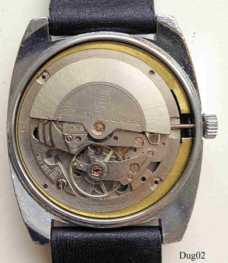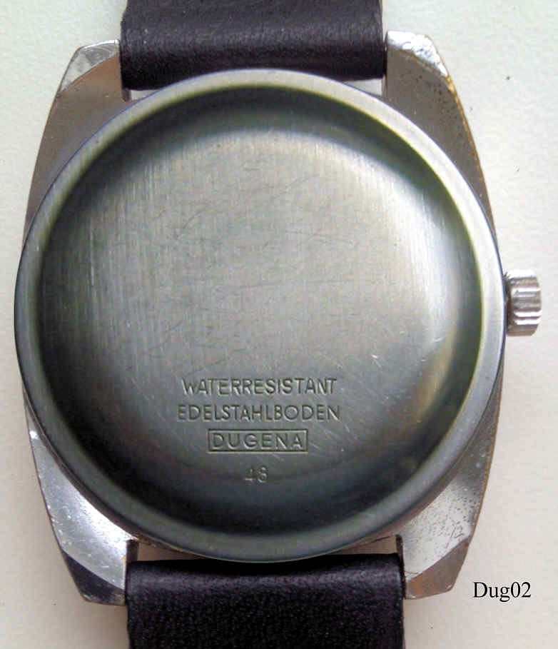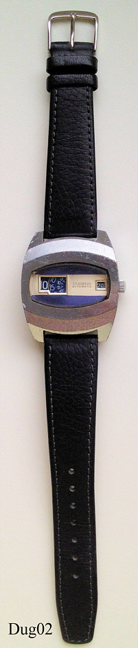 Dies ist eine Dugena Automatic Digitaluhr. Sie hat ein normales Automaticwerk mit Datum, statt der Zeiger drehen sich aber drei Scheiben: Stunden-, Minuten- und Sekundenscheibe. Die Uhrzeit wird dann in einem Fenster abgelesen. Ein recht ungewohntes Verfahren, es ist ausgesprochen mühsam, die Uhrzeit zu erkennen. Beschriftet vorn: ” Dugena, Automatic”, hinten: “Water Resistant, Edelstahlboden, DUGENA, 48”, innen: “FB, 25 twentyfive Jewels, BF3 223”, Kaliber Förster 223.
