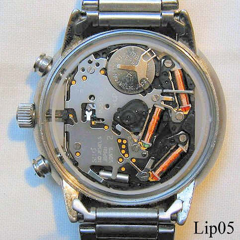 Ein Lip Chronograph mit Edelstahl Gehäuse und Stainless Steel Back. Kaliber SIIO VD57B, Beschriftung vorn: “Lip, Chronographe, 10 ATM”, hinten: ”Font Acier, Etanche, 10 ATM, Lip, 1053212, www.lip.fr, innen: “SIIO, No Jewels, Japan, VD57B”. Edelstahlarmband.