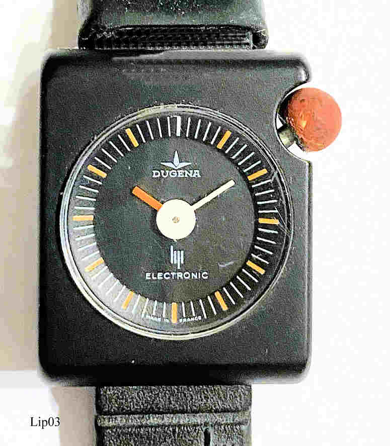 Eine sehr interessante Lip Damen Electronic Uhr ganz in Schwarz, gestaltet von Roger Tallon in seiner berühmten Serie mit den großen Kugelknöpfen. Inschrift vorn: ”Dugena, Lip, Electronic, Made in France”, hinten: ”951185, 80”, innen: ”14 Fourteen Jewels unadjusted”. Kautschukarmband ebenfalls in schwarz mit sehr breiter Schließe. Caliber Lip RE50, ETA 9190.