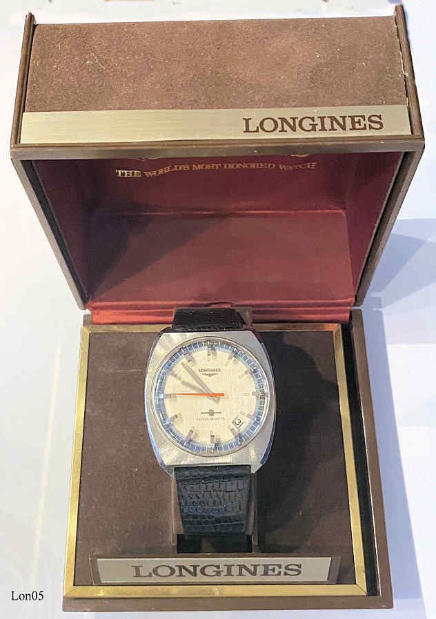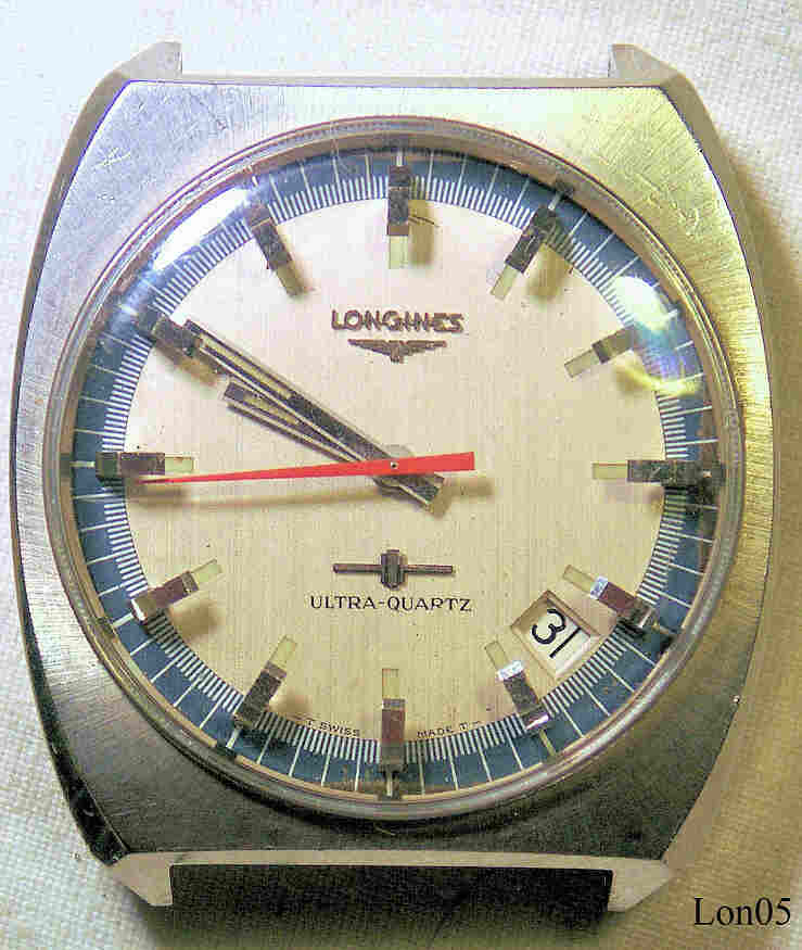 Dieses Longines 6512 Werk wurde während des Projektes Beta 21 entwickelt. Longines sagt, man wollte keine Abhängigkeit von großen Elektronik Konzernen und hat sich deshalb entschieden, eine diskrete Elektronik (14 Transistoren,19 Widerstände und 7 Kondensatoren) selbst zu bauen, anstatt eine integrierte Schaltung zu benutzen. Ein sicher sehr kostspieliges Verfahren. Auch ein Steppermotor stand noch nicht zur Verfügung, er wurde ebenfalls selbst entwickelt. Beschriftet Front: ”Longines, Ultra-Quartz”, hinten: “Longines, Ultra-Quartz, 16, 106960, Stainless Steel”, innen: ”6512, Longines Swiss, Eight 8 Jewels, Unadjusted, 31594380”. Kalender zwischen 4 und 5. Dies ist eine der wenigen noch funktionstüchtigen Ultras, die weltweit erste und einzige Kybernetische Armbanduhr, Stückzahl ca. 2000.