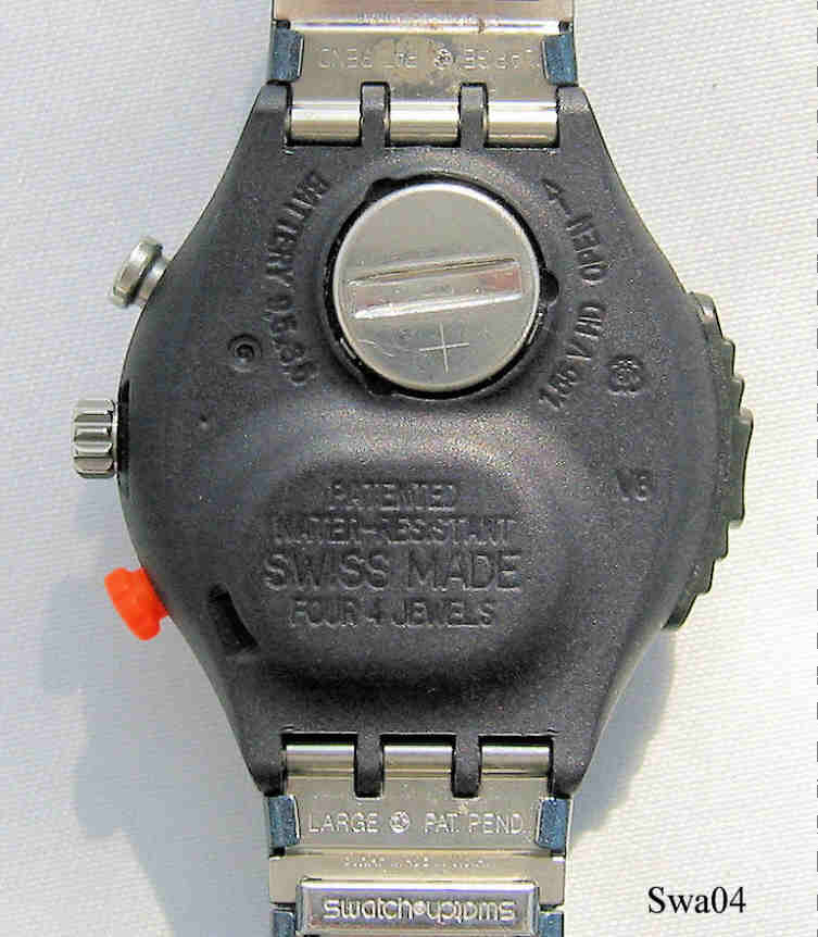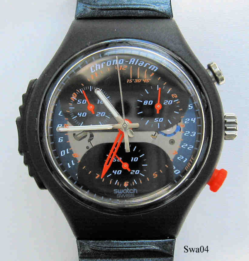 Eine Swatch Chrono Alarm Uhr, Modell “Activation” SOI401 aus der Herbst/Winter Kollektion 1998 mit schwarzem Kunststoff Gehäuse. Beschriftet vorn: “Chrono Alarm, Swatch, Swiss”, hinten: ”Battery 9,5 x 3,6; 1,55 V HD, open ->, patented, Water Resistant, Swiss Made, four 4 Jewels, ETA, V8”. Swatch Metall Flex Armband. Die Datumsscheibe ist durch das Teilzifferblatt rechts und links zu sehen, das Datum wird bei der “3”abgelesen. Neben der normalen Chrono (Stoppuhr-) Funktion hat diese Uhr auch einen integrierten Wecker. Die Weckzeit wird über die leuchtende rote Krone eingestellt, der große rote Zeiger zeigt die Weckzeit an. Mit dem Schiebeschalter an der linken Seite wird die Weckfunktion eingeschaltet.