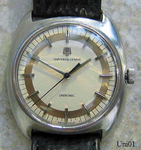 Dies ist eine Universal Genève Unisonic, neben der Citizen Hisonic die einzige Stimmgabeluhr mit dem Bulova 2180 Werk. Werk N° 2’836’668, Universal Caliber 1-51, Referenz Nr.: 851101, Beschriftet vorn: ”Universal Geneve, Unisonic, -Swiss Made - T”, hinten: “851101, 2836668”, innen: ”15 Fifteen Jewels, 1-51, Universal Geneve, unadjusted”