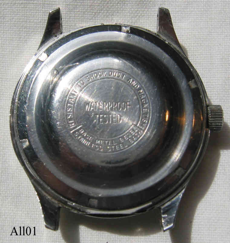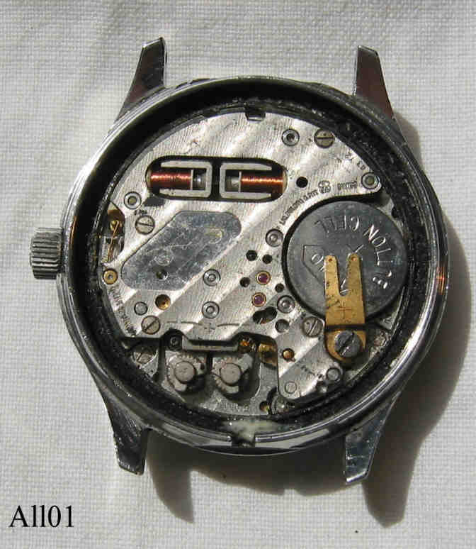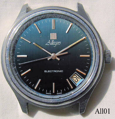 Dies ist eine Allegro Electronic Stimmgabeluhr mit Kalender in Edelstahl, ESA 9162, original mit Flexarmband aus Edelstahl. Beschriftet: “Allegro Electronic”, Rückseite: ”Resistant to Shock, Dust and Magnetism, Base Metal Bezel, Stainless Steel Back, Waterproof Tested”. Das Werk ist, wohl im Rahmen einer Reparatur, getauscht worden, daher fehlt die Zenith Signatur im Logofeld des Werkes. .