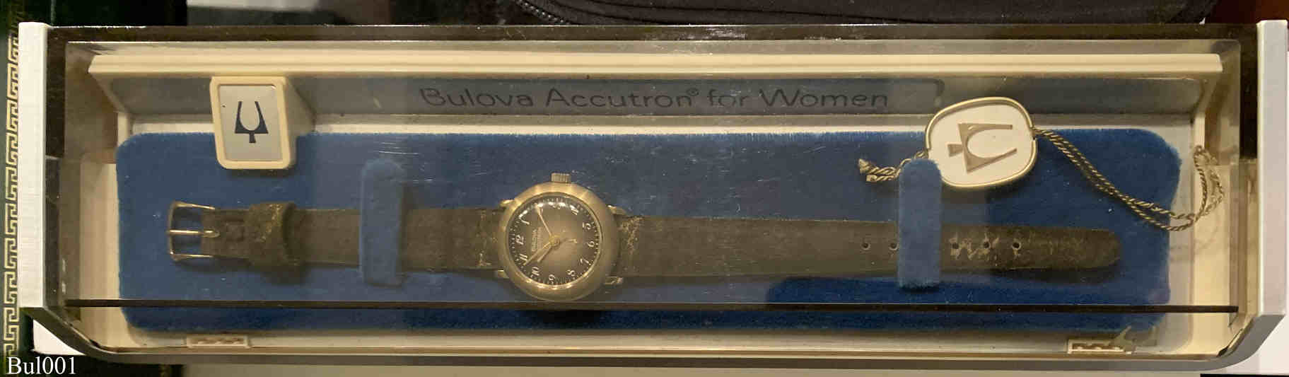 Eine Bulova Accutron Damenuhr mit matt vergoldetem Gehäuse, Beschriftet vorn: “Bulova, Accutron”, hinten: ”Bulova, Patented, Stainless Steel, Water Resistant, N4, F00638, Gravur: R.S.M., 25 Years, Nationwide, Insurance”, innen: ”Patent, BulovaWatch Co., Swiss 13 Thirteen Jewels, Unadjusted, N4, 2301” Caliber 2301, Herstelldatum 1974 (N4), braunes Samtarmband.