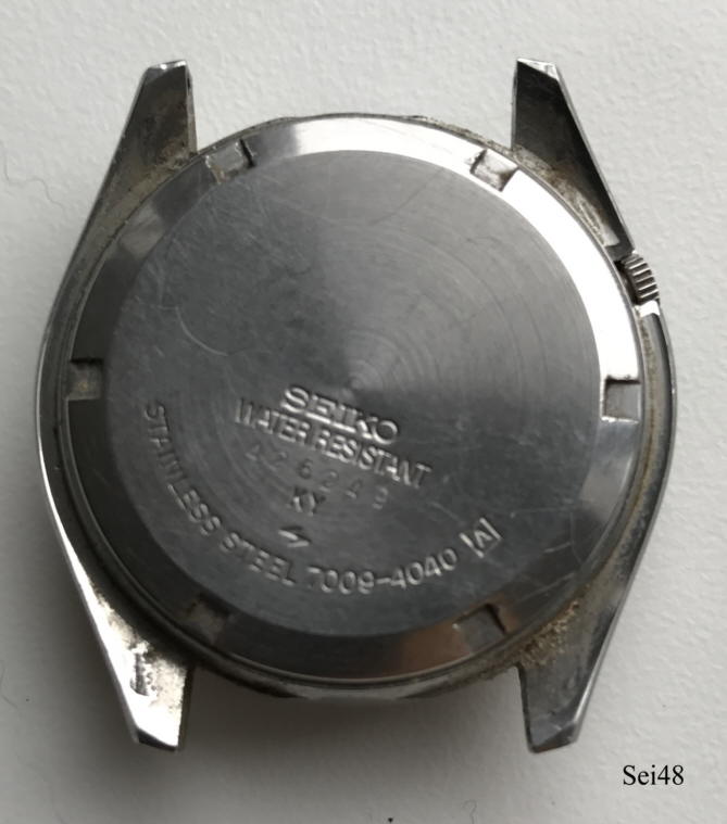 A Seiko 5 Automatic watch with stainless steel case, silver dial and Day/Date display at 3. Signed front:” SEIKO, 5, Automatic, 7009-334 R“, back: “Seiko, Water Resistant, 426249, Stainless Steel, KY, 7009- 4040 A”, inside: “Seiko Time Corp, 7009, Seventeen Jewels” Stainless Steel Case.