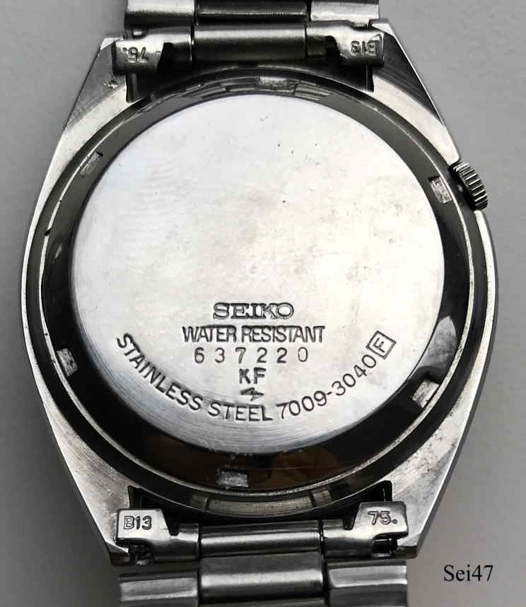 Dies ist eine Seiko 5 Automatik Uhr mit Edelstahl Gehäuse, guillochiertem weißen Zifferblatt und Day/Date Anzeige bei der 3. Beschriftung vorn:” SEIKO, 5, Automatic, 7009-405 R“, hinten: “Seiko, Water Resistant, 537220, Stainless Steel, KF, 7009- 3040 A”, innen: “Seiko Time Corp, 7009A, Seventeen Jewels”. Edelstahlgehäuse mit Edelstahl Boden.