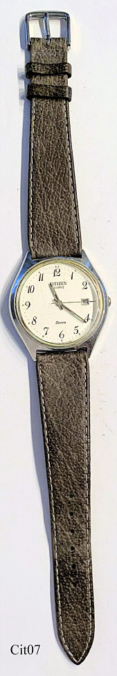 Dies ist eine Citizen Quartz Uhr, Modell Seven, Datum bei der 3. Beschriftet vorn: ”Citizen, Quartz, Seven, P-2110 6-051413 8NO”, hinten: ”Citizen, Water Resist, Stainless, 2110-942051SMK, 40302341, AY-31720”, innen: “Citizen, Watch Co.,One 1 Jewes, 2110A, Unadjusted, Japan”.